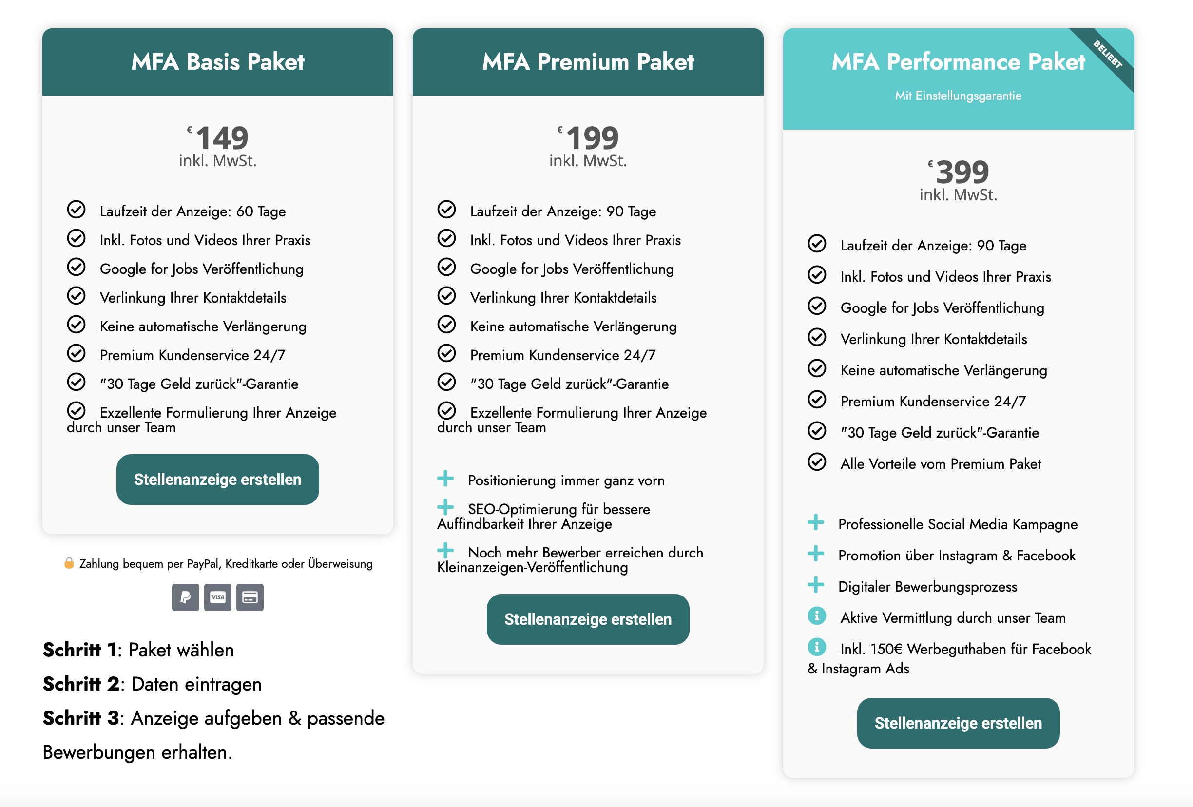 MFA-gesucht ist kein allgemeines Jobportal, sondern spezialisiert auf medizinische Fachangestellte – und genau das macht den Unterschied. Ihre Anzeige wird nicht zwischen branchenfremden Stellen übersehen, sondern gezielt von MFAs gefunden.